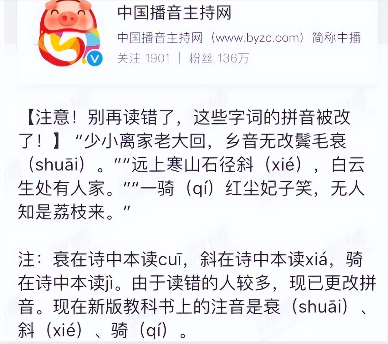 中國(guó)播音主持網(wǎng)就科普了很多被修訂的讀音
