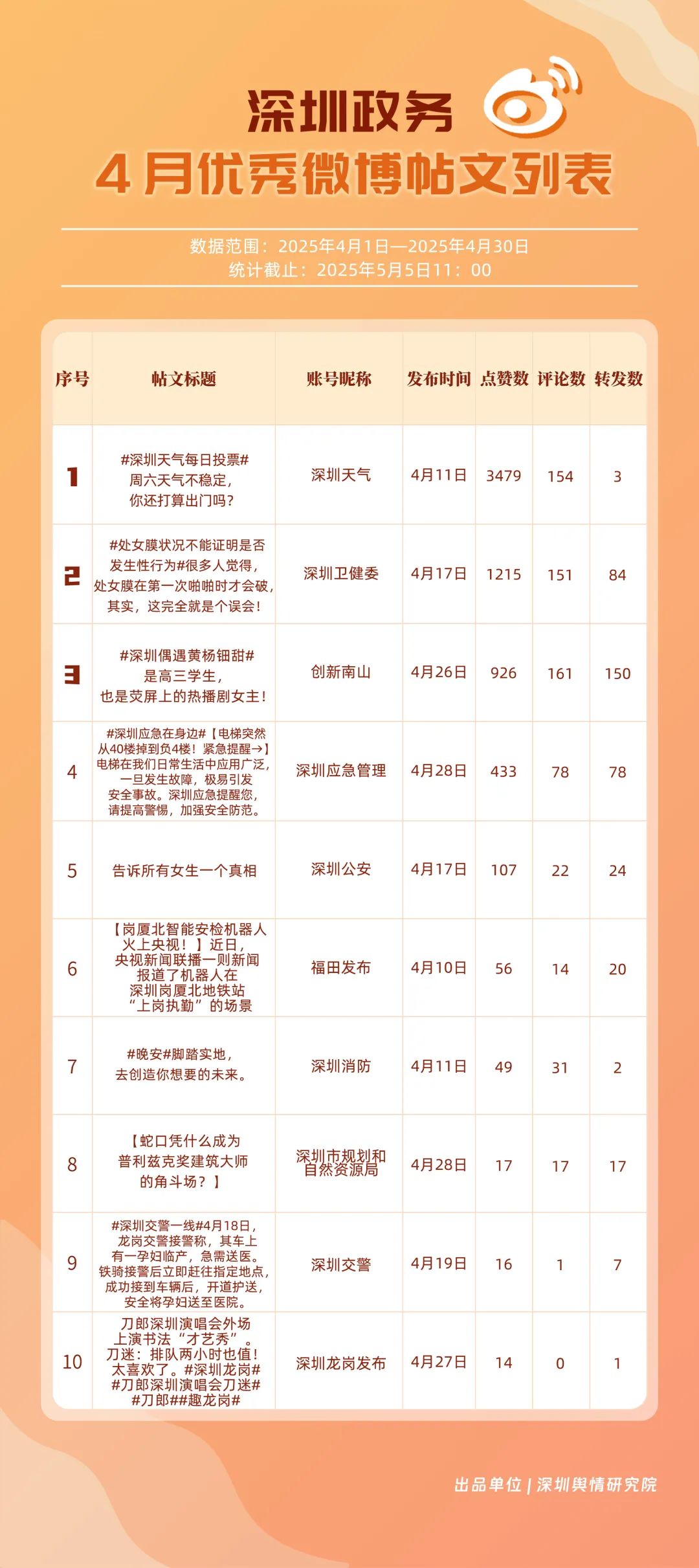 4月,“深圳天氣”“深圳衛(wèi)健委”“深圳消防”“深圳應(yīng)急管理”“創(chuàng)新南山”“深圳公安”“福田發(fā)布”“深圳龍崗發(fā)布”“深汕發(fā)布”“深圳交警”等20個賬號入選“優(yōu)秀政務(wù)微博號”。值得一提的是,“深圳天氣”在多個指標(biāo)中獲得滿分,其氣象信息的趣味性和實用性受到市民認(rèn)可;“深圳衛(wèi)健委”“深圳消防”“深圳應(yīng)急管理”也在信息傳播、互動服務(wù)等方面持續(xù)發(fā)力,以超過90分的總分緊跟其后;“深汕發(fā)布”“深圳交警”相較于3月在榜單排名有所提升,展現(xiàn)出強勁的發(fā)展勢頭。這些優(yōu)秀政務(wù)微博號的脫穎而出,不僅體現(xiàn)了各自的運營實力,更反映出深圳政務(wù)新媒體在微博平臺的蓬勃發(fā)展態(tài)勢。