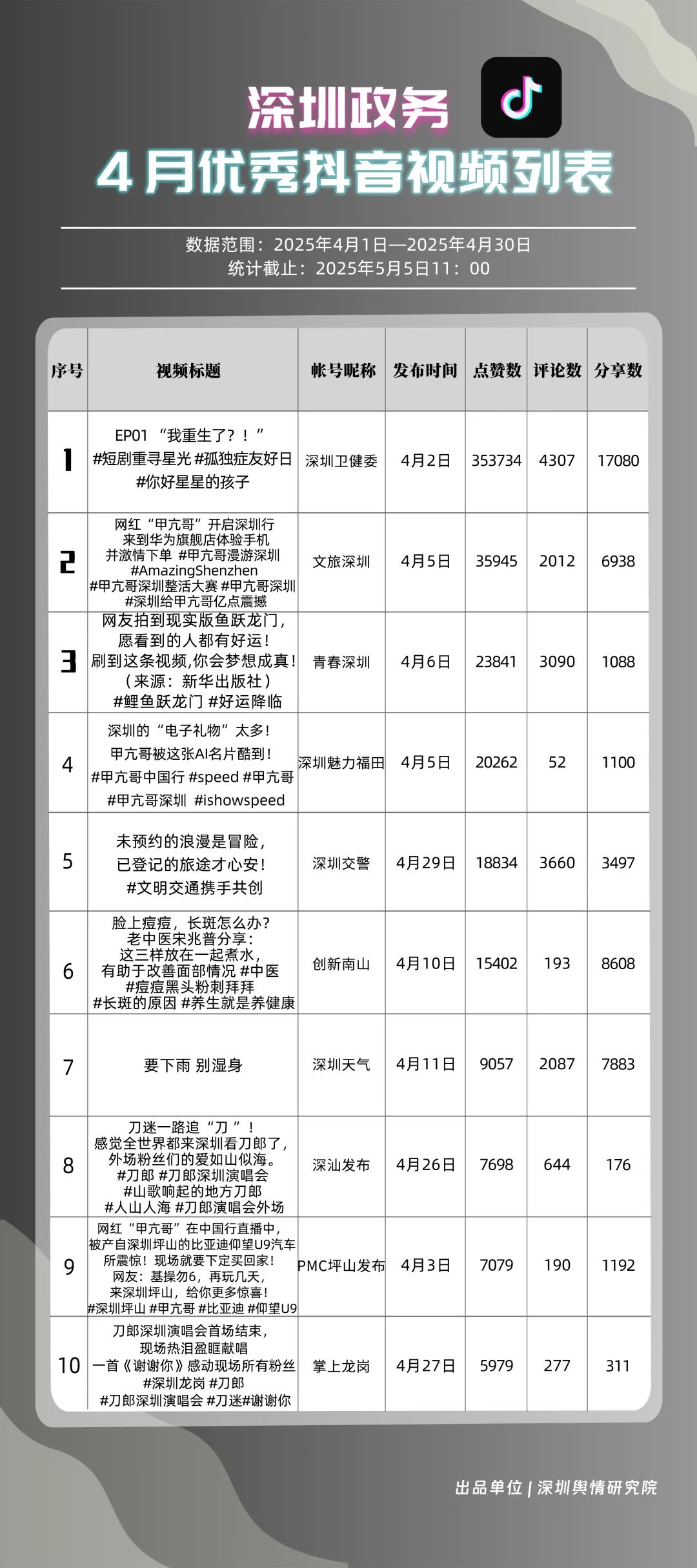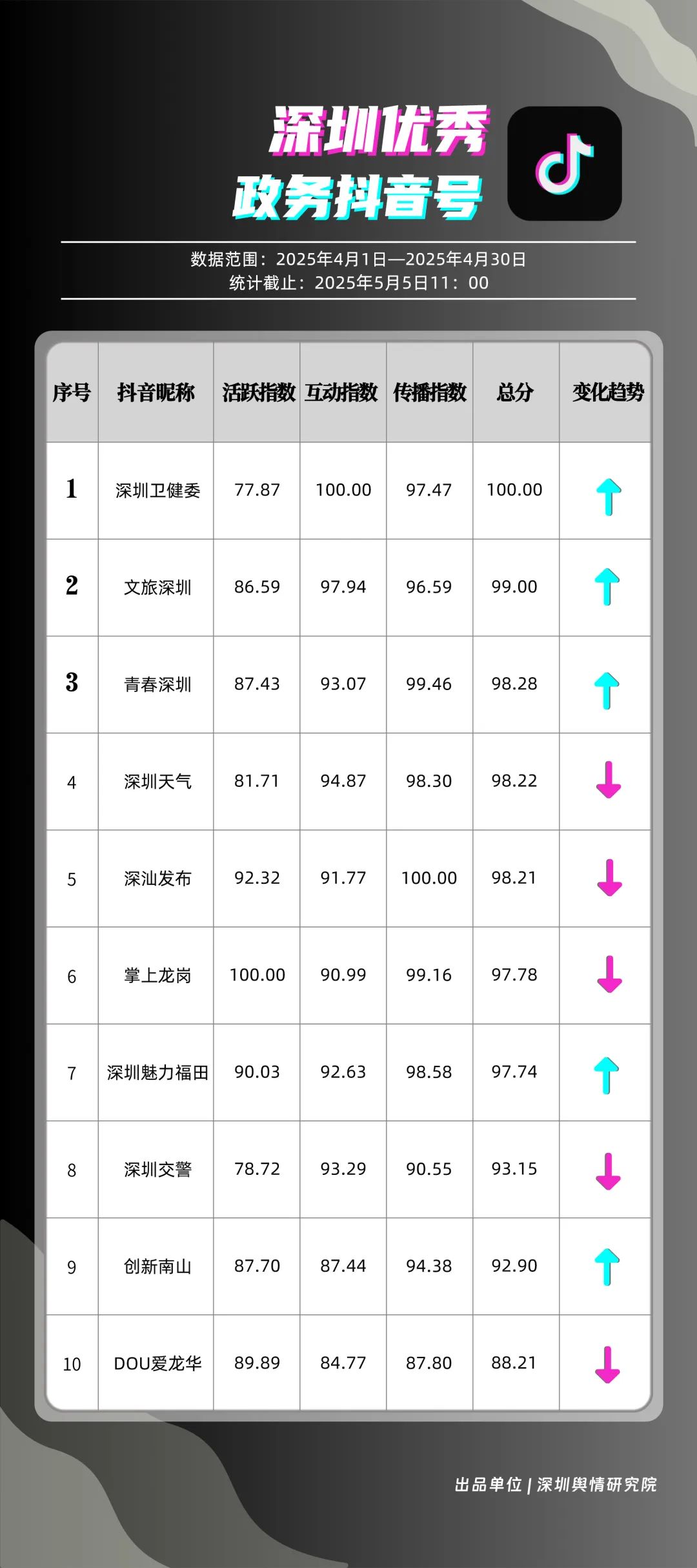 4月,“深圳衛(wèi)健委”“文旅深圳”“青春深圳”“深圳天氣”“深汕發(fā)布”“掌上龍崗”“深圳魅力福田”“深圳交警”“創(chuàng)新南山”“DOU愛龍華”共10個政務(wù)抖音號獲得“優(yōu)秀政務(wù)抖音號”稱號。4月,“深圳衛(wèi)健委”“文旅深圳”“青春深圳”憑借新穎的內(nèi)容策劃、生動的短視頻呈現(xiàn)方式,實現(xiàn)排名提升,位居榜單前三?!吧钲谔鞖狻薄吧钌前l(fā)布”緊隨其后,以優(yōu)質(zhì)實用的內(nèi)容、接地氣的表達,持續(xù)擴大政務(wù)新媒體的傳播聲量。上榜賬號積極探索創(chuàng)新傳播路徑,以生動有趣的方式傳遞政務(wù)信息,為深圳政務(wù)新媒體在短視頻領(lǐng)域的發(fā)展注入新活力。