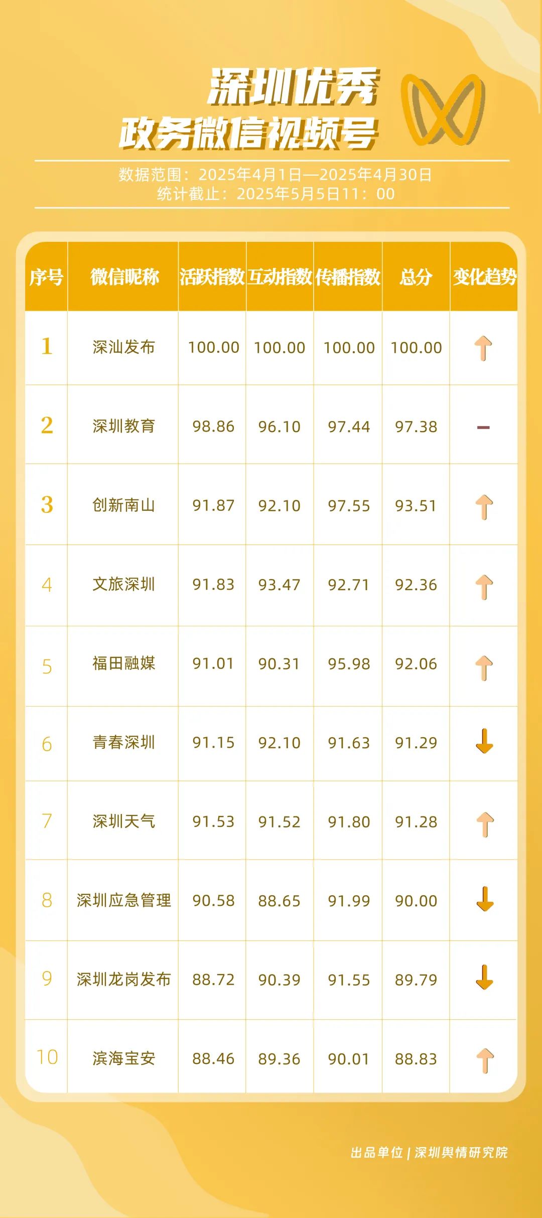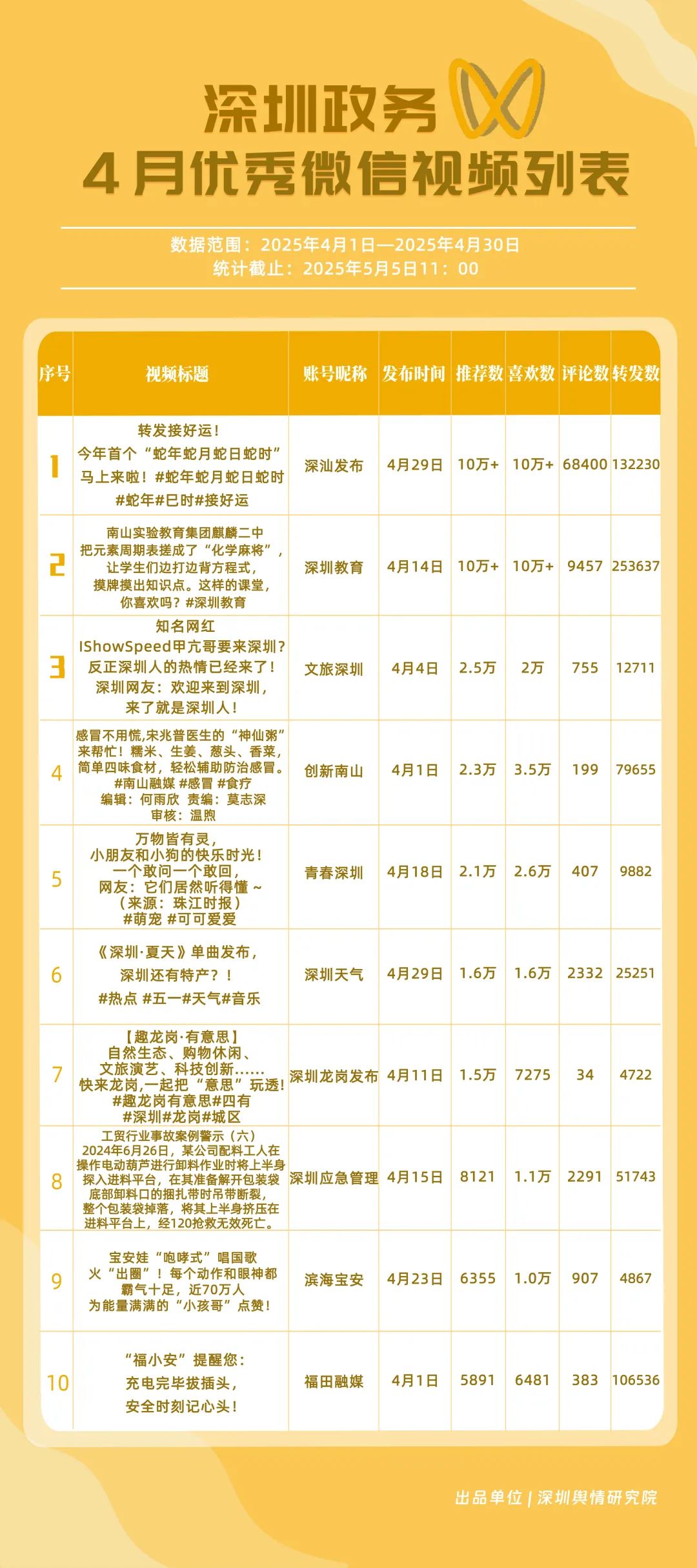 4月,獲“深圳優(yōu)秀政務(wù)微信視頻號”稱號的是“深汕發(fā)布”“深圳教育”“創(chuàng)新南山”“文旅深圳”“福田融媒”“青春深圳”“深圳天氣”“深圳應(yīng)急管理”“深圳龍崗發(fā)布”“濱海寶安”。其中,“深汕發(fā)布”憑借亮眼的數(shù)據(jù)表現(xiàn)成為榜首,其一條有關(guān)“蛇年蛇月蛇日蛇時”的視頻作品點贊量超10萬次、評論量超6.8萬次,轉(zhuǎn)發(fā)量超13萬次;“深圳教育”持續(xù)穩(wěn)定輸出優(yōu)質(zhì)內(nèi)容,以扎實的運營實力鞏固自身影響力,位居榜單第2位;“創(chuàng)新南山”“文旅深圳”“福田融媒”分別位列榜單第3、4、5位,總分超92分,在區(qū)域形象宣傳、文旅資源推廣等方面展現(xiàn)出卓越的傳播效能,成為傳遞區(qū)域特色與發(fā)展動態(tài)的重要窗口。