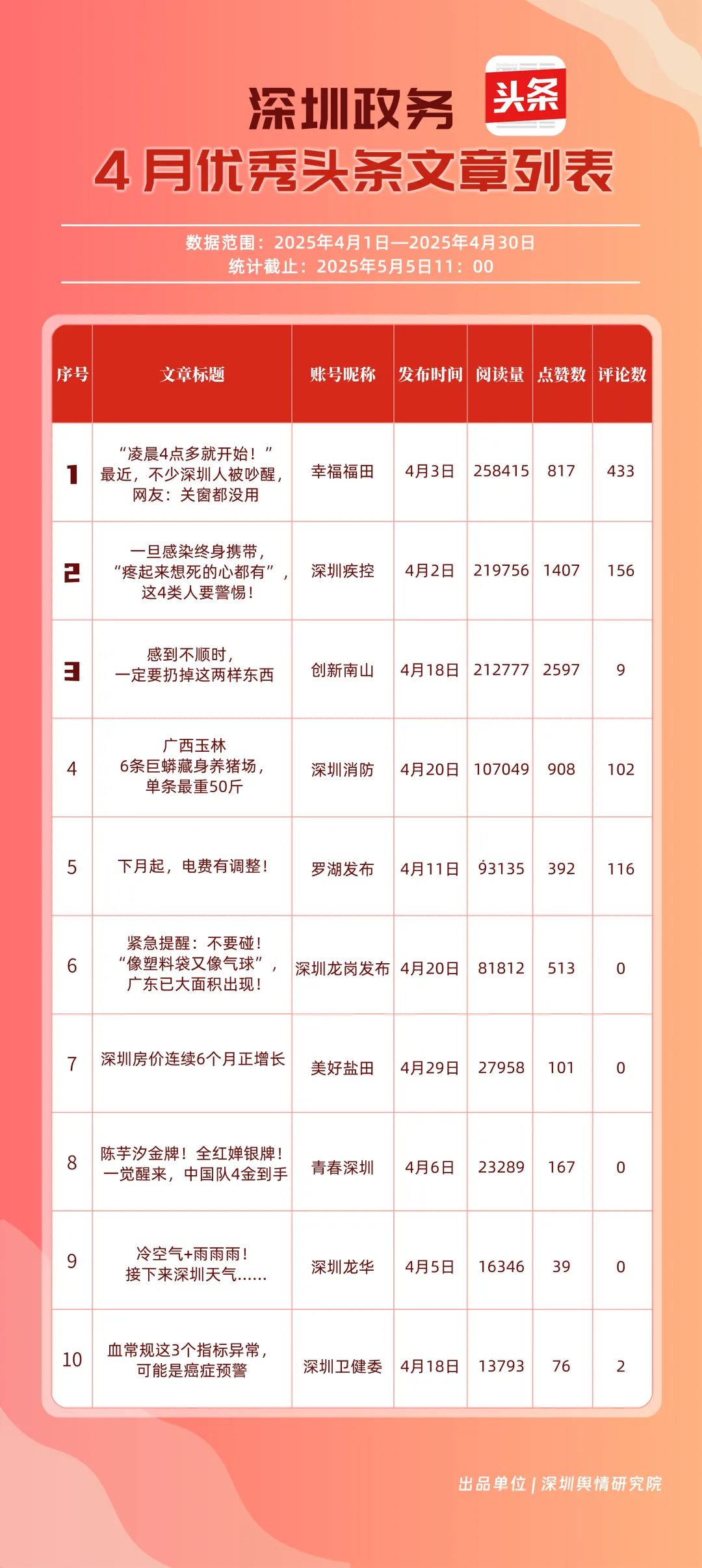 本期榜單數(shù)據(jù)收集自微信(含公眾號、視頻號)、微博、抖音、今日頭條,統(tǒng)計賬號數(shù)量為227個,統(tǒng)計數(shù)據(jù)時間范圍為2025年4月1日至4月30日,截止時間為5月5日11:00。