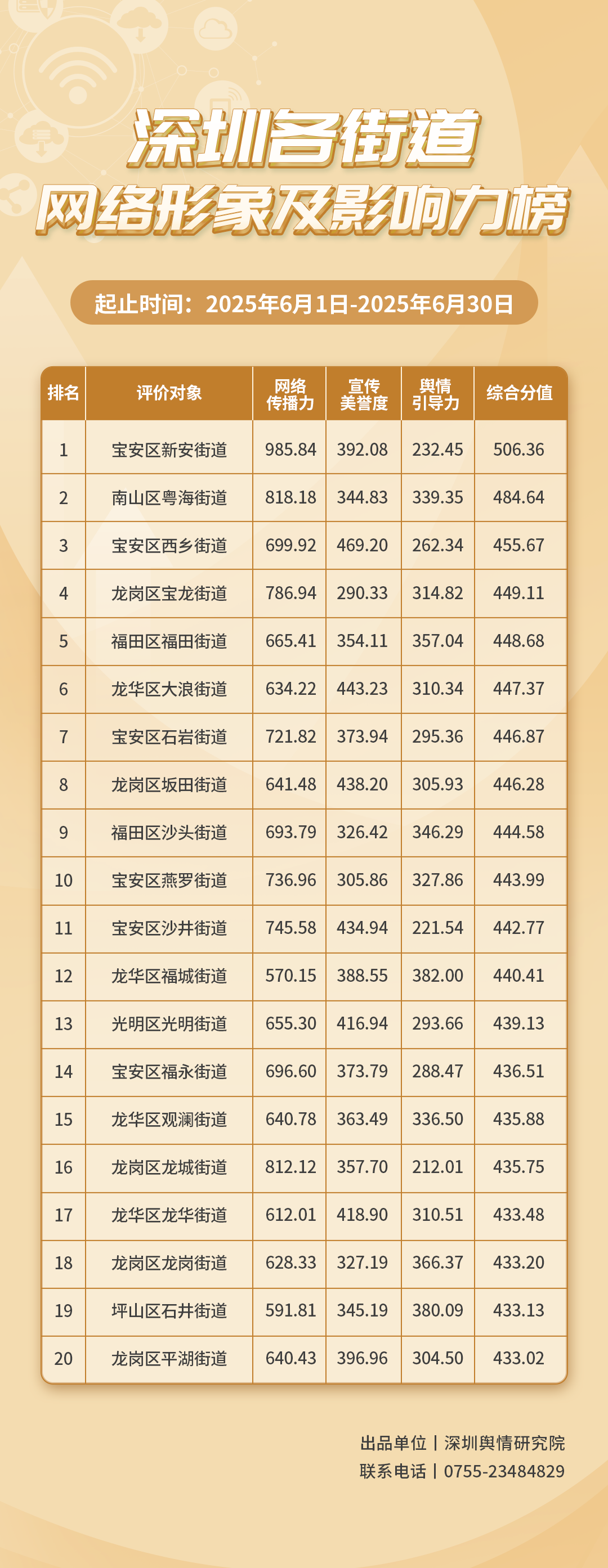 2025年6月,共有20個街道登上《深圳各街道網(wǎng)絡(luò)形象及影響力榜》,分別是:寶安區(qū)新安街道、南山區(qū)粵海街道、寶安區(qū)西鄉(xiāng)街道、龍崗區(qū)寶龍街道、福田區(qū)福田街道、龍華區(qū)大浪街道、寶安區(qū)石巖街道、龍崗區(qū)坂田街道、福田區(qū)沙頭街道、寶安區(qū)燕羅街道、寶安區(qū)沙井街道、龍華區(qū)福城街道、光明區(qū)光明街道、寶安區(qū)福永街道、龍華區(qū)觀瀾街道、龍崗區(qū)龍城街道、龍華區(qū)龍華街道、龍崗區(qū)龍崗街道、坪山區(qū)石井街道、龍崗區(qū)平湖街道。