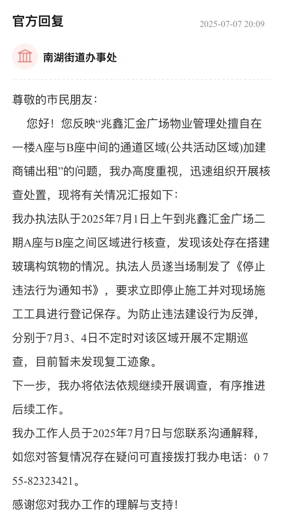 從市民反饋到執(zhí)法處置,羅湖區(qū)南湖街道辦事處以快速響應(yīng)、精準(zhǔn)執(zhí)法展現(xiàn)治理效能。通過(guò)現(xiàn)場(chǎng)核查、制發(fā)《停止違法行為通知書(shū)》、登記保存施工工具等措施,及時(shí)遏制違法搭建勢(shì)頭,并建立不定期巡查機(jī)制防止反彈。從“即時(shí)制止”到“長(zhǎng)效監(jiān)督”的閉環(huán)管理,維護(hù)了業(yè)主合法權(quán)益與消防通道安全,為城市違建治理提供了高效務(wù)實(shí)的實(shí)踐樣本,彰顯基層執(zhí)法部門(mén)守護(hù)民生安全的責(zé)任擔(dān)當(dāng)。