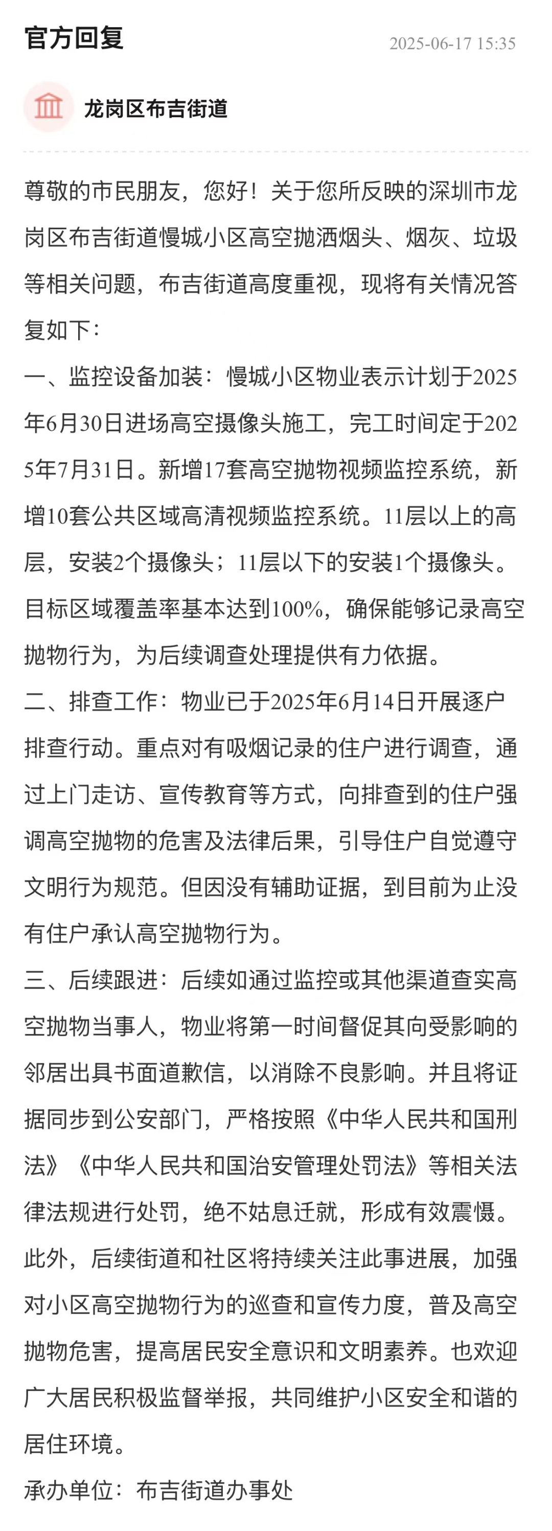 高空拋物嚴(yán)重威脅居民人身與財(cái)產(chǎn)安全,需嚴(yán)肅對(duì)待。街道辦接到相關(guān)反映后,積極推動(dòng)物業(yè)規(guī)劃加裝視頻監(jiān)控系統(tǒng),明確了施工和完工時(shí)間,同時(shí)安排物業(yè)開(kāi)展逐戶排查,重點(diǎn)調(diào)查有吸煙記錄住戶,體現(xiàn)出對(duì)問(wèn)題的重視和解決問(wèn)題的行動(dòng)力。在后續(xù)保障方面,明確查實(shí)拋物當(dāng)事人后將督促其道歉并交由公安部門(mén)依規(guī)處罰,街道和社區(qū)也將持續(xù)關(guān)注、加強(qiáng)巡查與宣傳,為維護(hù)小區(qū)安全提供了有力支持。