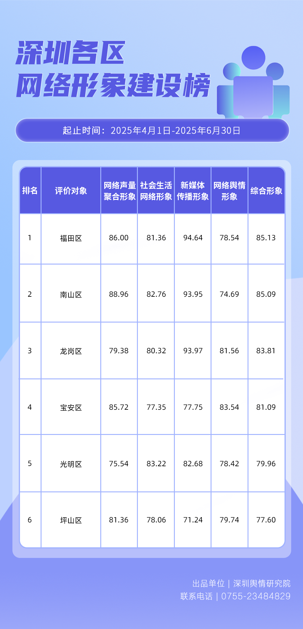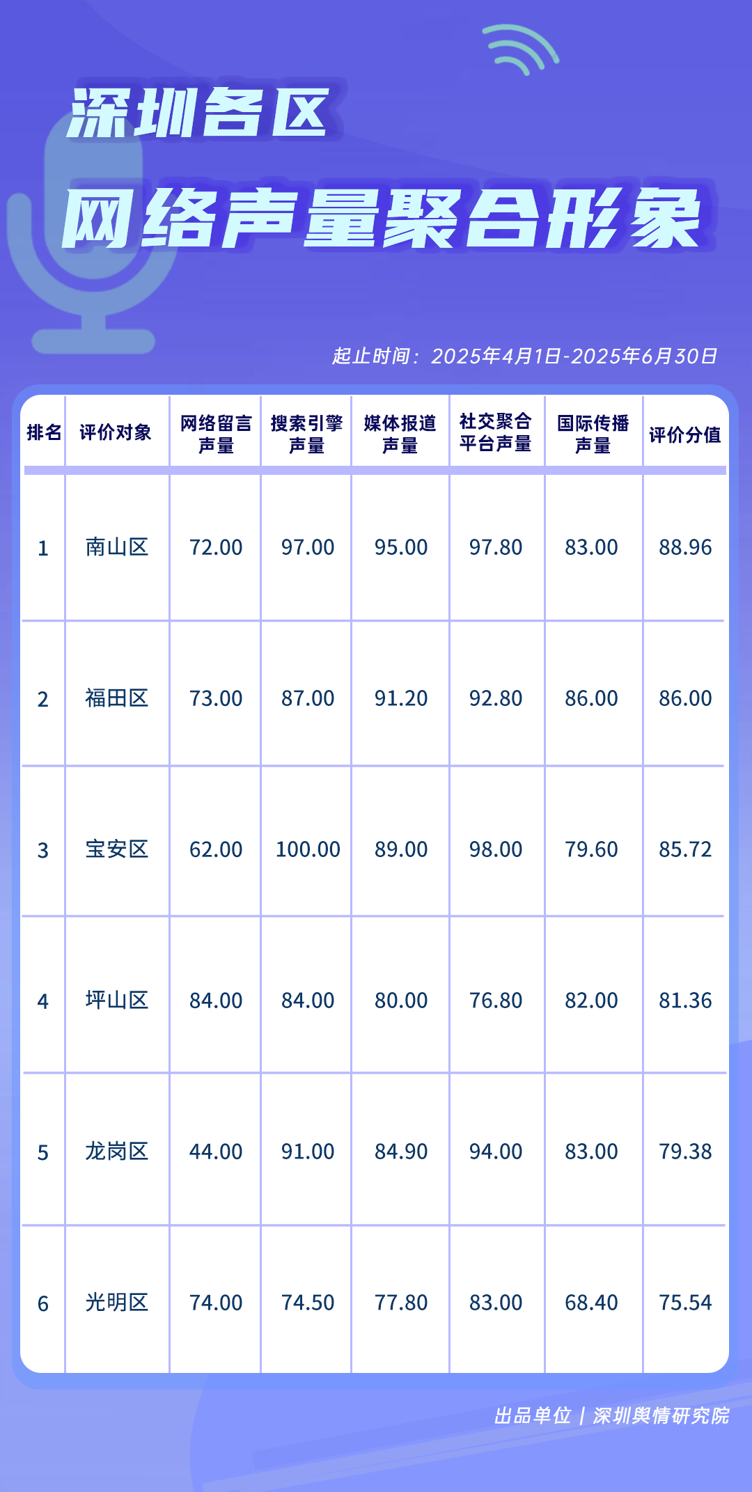 4-6月,各區(qū)各單位網(wǎng)絡(luò)形象建設(shè)取得了哪些成效?《深圳各區(qū)各單位網(wǎng)絡(luò)形象建設(shè)榜》帶您了解。本期榜單數(shù)據(jù)統(tǒng)計(jì)時(shí)間范圍為2025年4月1日至6月30日。