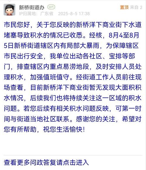您好,獲悉情況后,我街道高度重視,工作人員立即到現場進行核實處置。經處置,該路段積水已清理完畢。同時,街道已督促城市管家重點清理周邊雨水篦子,確保排水暢通,防止雨后積水。