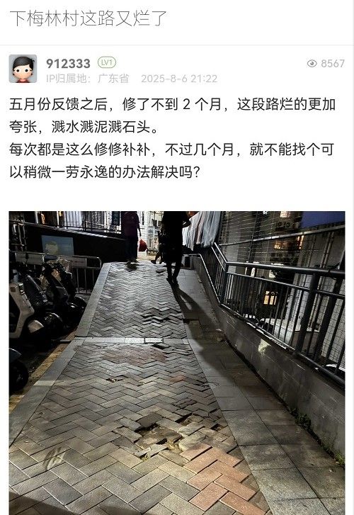 網友您好,您的留言已收悉,現將相關處理情況回復如下:經核實,梅林街道圍面一街(四號路)存在人行道部分破損坑洼問題,收到您的反映后梅林街道已第一時間協調市交通運輸局福田管理局安排道路養(yǎng)護單位進行修復,并于2025年8月7日下午完成。后續(xù)梅林街道將加強巡查,及時協調管養(yǎng)單位進行維護,督促落實管養(yǎng)責任。如您有其他意見建議,歡迎直接電話聯系梅林街道應急辦075523996865反映,感謝您的支持和理解!