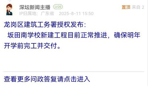 23. 帖文《龍崗區(qū)坂田南學校施工進度怎樣了?26年9月能招生嗎?》