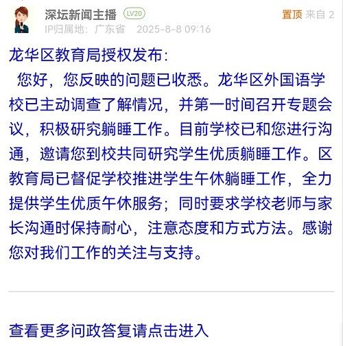 您好,您反映的問題已收悉。龍華區(qū)外國語學校已主動調查了解情況,并第一時間召開專題會議,積極研究躺睡工作。目前學校已和您進行溝通,邀請您到校共同研究學生優(yōu)質躺睡工作。區(qū)教育局已督促學校推進學生午休躺睡工作,全力提供學生優(yōu)質午休服務;同時要求學校老師與家長溝通時保持耐心,注意態(tài)度和方式方法。感謝您對我們工作的關注與支持。