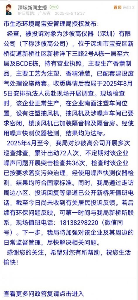 經查,被投訴對象為沙彼高儀器(深圳)有限公司(下稱沙彼高公司),位于深圳市寶安區(qū)新橋街道新橋社區(qū)新橋洋下三路2號A棟一層至六層及BCDE棟,持有營業(yè)執(zhí)照,主要生產香薰制品,主要工藝為注塑、香精灌裝,已配套建設廢氣處理設施兩套。收悉輿情后我局于2025年8月5日安排執(zhí)法人員赴現場開展調查?,F場檢查時,該企業(yè)正常生產,在企業(yè)南面注塑車間位置,設有注塑抽風機,抽風機及涉噪聲車間已要求密閉,樓頂風機已加裝隔音棉及隔音房。經使用噪聲快測儀器檢測,結果均為達標。
