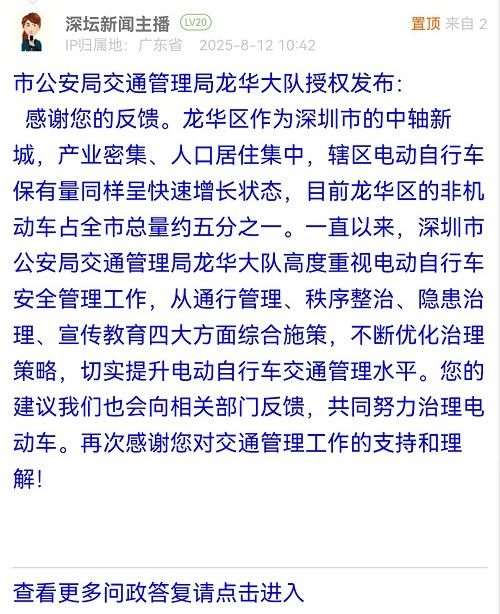 感謝您的反饋。龍華區(qū)作為深圳市的中軸新城,產業(yè)密集、人口居住集中,轄區(qū)電動自行車保有量同樣呈快速增長狀態(tài),目前龍華區(qū)的非機動車占全市總量約五分之一。一直以來,深圳市公安局交通管理局龍華大隊高度重視電動自行車安全管理工作,從通行管理、秩序整治、隱患治理、宣傳教育四大方面綜合施策,不斷優(yōu)化治理策略,切實提升電動自行車交通管理水平。您的建議我們也會向相關部門反饋,共同努力治理電動車。再次感謝您對交通管理工作的支持和理解!