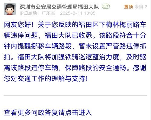 網友您好!關于您反映的福田區(qū)下梅林梅麗路車輛違停問題,福田大隊已收悉。該路段符合十分鐘內提醒挪移車輛路段,暫未設置嚴管路違停抓拍。福田大隊將加強鐵騎巡邏整治力度,及時驅離該路段違停車輛,保障路段的安全通暢。感謝您對交通工作的理解與支持!