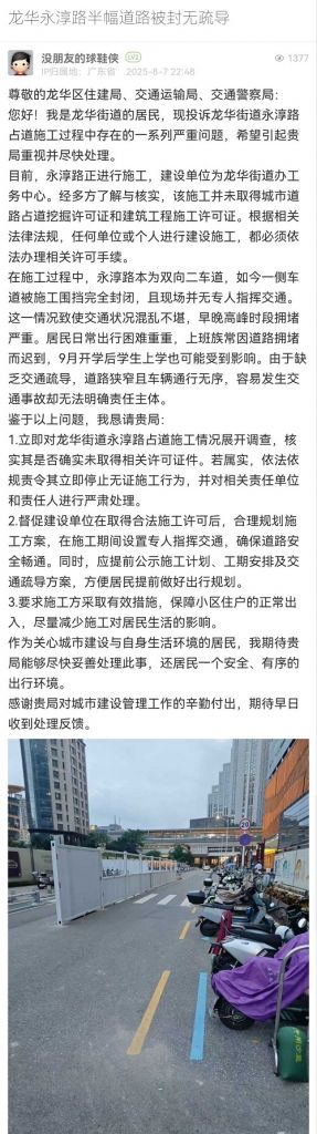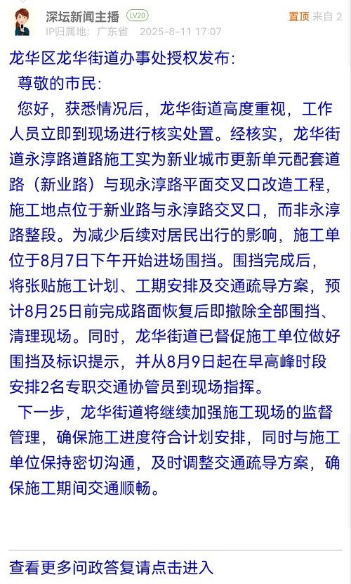 您好,獲悉情況后,龍華街道高度重視,工作人員立即到現場進行核實處置。經核實,龍華街道永淳路道路施工實為新業(yè)城市更新單元配套道路(新業(yè)路)與現永淳路平面交叉口改造工程,施工地點位于新業(yè)路與永淳路交叉口,而非永淳路整段。為減少后續(xù)對居民出行的影響,施工單位于8月7日下午開始進場圍擋。圍擋完成后,將張貼施工計劃、工期安排及交通疏導方案,預計8月25日前完成路面恢復后即撤除全部圍擋、清理現場。同時,龍華街道已督促施工單位做好圍擋及標識提示,并從8月9日起在早高峰時段安排2名專職交通協管員到現場指揮。