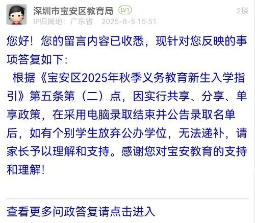 根據《寶安區(qū)2025年秋季義務教育新生入學指引》第五條第(二)點,因實行共享、分享、單享政策,在采用電腦錄取結束并公告錄取名單后,如有個別學生放棄公辦學位,無法遞補,請家長予以理解和支持。感謝您對寶安教育的支持和理解!