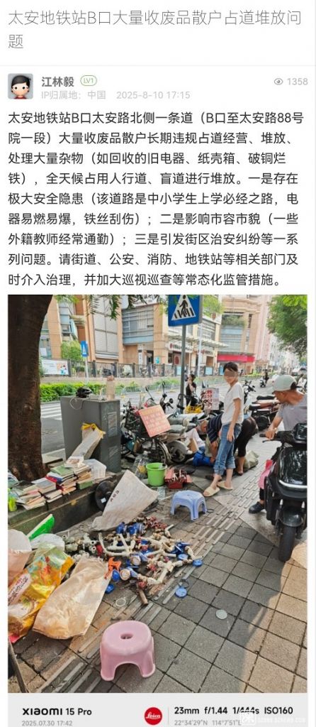 尊敬的市民:您好!您反映的問題我隊已收悉。收到情況后,我隊高度重視,第一時間安排工作人員前往現場核實,相關處置情況如下:8月11日,我隊工作人員對太安地鐵站B口及周邊開展巡查,暫未發(fā)現占道回收廢品的人員。鑒于流動收廢品人員無固定回收時間和攤位,我隊已安排工作人員在太安地鐵站B口周邊分時段值守,若發(fā)現相關占道經營人員,將立即予以勸離。對于不配合勸導的相關人員,將予以暫扣經營工具等措施。感謝您對城市管理工作的理解與支持!