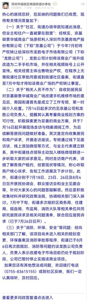 (二)關于“相關人員不作為”:自收到居民反對京基御景華城商業(yè)廣場改建手機維修市場的意見后,南園街道首先是成立了工作專班,第一時間介入處置。7月14日起多次約見京基公司和龍勝公司負責人,提醒其認真考量商業(yè)規(guī)劃方案的可行性,積極探索更為妥善的商業(yè)方案,并于7月16日起開展現場走訪與檔案調閱工作,為后續(xù)解答居民問題做好準備。其次是定向收集居民和商戶訴求,開展走訪座談。專班通過線下見面訪談、線上添加微信等方式,與業(yè)主代表建立聯系,其中街道掛點領導主動加入樓棟微信群進一步聽取大家的訴求意見。同時走訪商戶代表,詳細了解各商戶租約、經營現狀等情況,耐心聽取商戶核心訴求,告知工作進展及下步計劃。此外,街道分別于7月18日、23日、26日及8月4日召開居民協調會、群眾接訪會和業(yè)主見面會等,針對大家關心的問題答疑解惑。然后是積極收集材料并研究政策法規(guī),協調相關部門深入探討。7月中下旬,街道多次組織區(qū)商務局、住建局、規(guī)自局、市監(jiān)局、消防大隊等相關單位共同研究居民訴求及相關問題清單,聯合回應居民訴求(已于7月26日召開)。