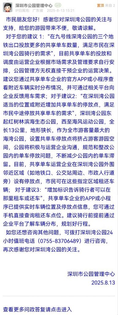對于您的建議 1:“在九號線深灣公園的三個地鐵出口投放更多的共享單車數量,滿足市民在深圳灣公園騎行的需求”,目前共享單車的投放和調度由運營企業(yè)根據市場需求及管理要求自行安排,公園管理方無權直接干預企業(yè)的運營決策。建議您通過共享單車企業(yè)的官方APP或小程序查看附近車輛實時分布情況,并可通過相關平臺向企業(yè)反饋用車需求;對于建議2:“在深圳灣公園適當的位置或附近增加共享單車的停放點,滿足市民中途停放共享單車的需求”,深圳灣公園東起紅樹林濱海生態(tài)公園,西至海風運動公園,全長13公里,地形狹長,作為全市游客量最大的海灣公園,設置共單車停放點將擠占游客游園空間,公園將積極與運營企業(yè)溝通,規(guī)范和整改公園內的單車停放問題,不斷減少公園內的單車滯留。目前,共享單車運營企業(yè)在深圳灣公園外圍鄰近區(qū)域(如地鐵口、公交站周邊、市政人行道旁)設有停放點,市民可在這些指定區(qū)域租還車輛; 對于建議3:“增加標識告訴騎行者可以在那里租車或還車”,共享單車企業(yè)的APP或小程序已提供實時車輛位置及停放點信息,您可通過手機直接查詢租還車點位。建議騎行前提前通過企業(yè)平臺了解車輛分布,規(guī)劃好行程。