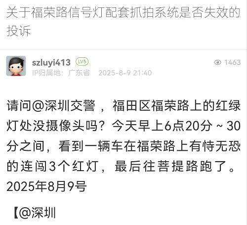 29. 帖文《關于福榮路信號燈配套抓拍系統是否失效的投訴》
