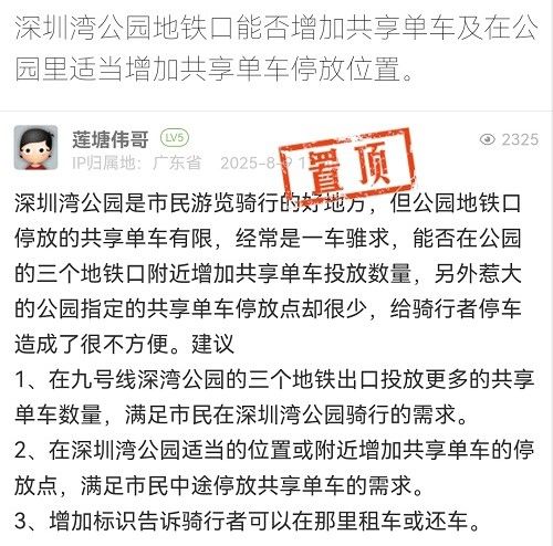 31. 帖文《深圳灣公園地鐵口能否增加共享單車及在公園里適當增加共享單車停放位置。》