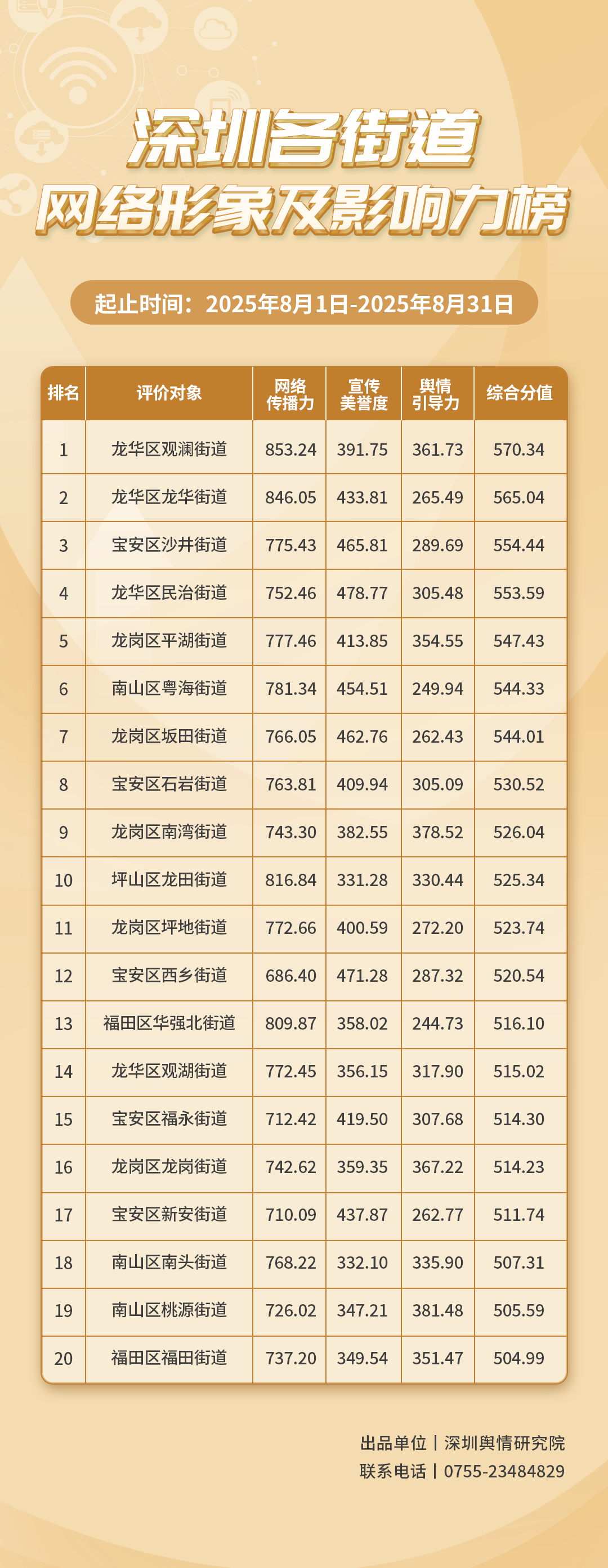 2025年8月,共有20個街道登上《深圳各街道網(wǎng)絡(luò)形象及影響力榜》,分別是:龍華區(qū)觀瀾街道、龍華區(qū)龍華街道、寶安區(qū)沙井街道、龍華區(qū)民治街道、龍崗區(qū)平湖街道、南山區(qū)粵海街道、龍崗區(qū)坂田街道、寶安區(qū)石巖街道、龍崗區(qū)南灣街道、坪山區(qū)龍?zhí)锝值?、龍崗區(qū)坪地街道、寶安區(qū)西鄉(xiāng)街道、福田區(qū)華強(qiáng)北街道、龍華區(qū)觀湖街道、寶安區(qū)福永街道、龍崗區(qū)龍崗街道、寶安區(qū)新安街道、南山區(qū)南頭街道、南山區(qū)桃源街道、福田區(qū)福田街道。