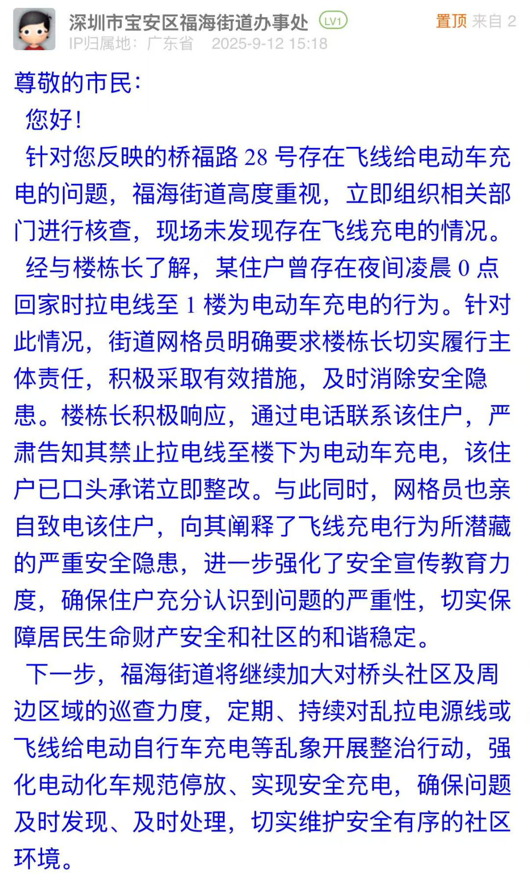 案例點評:福海街道辦對電動車“飛線充電”問題展現(xiàn)出快速響應、權責明晰的治理態(tài)度,第一時間組織核查,既明確主體責任、嚴令整改,又細致開展安全教育,讓住戶充分認知“飛線充電”的嚴重危害,體現(xiàn)執(zhí)法和普法的雙重擔當。回應中,街道辦還表示將強化巡查力度、開展整治行動,建立長效治理機制,維護社區(qū)安全秩序,彰顯了基層治理中“問題導向、標本兼治”的治理邏輯。