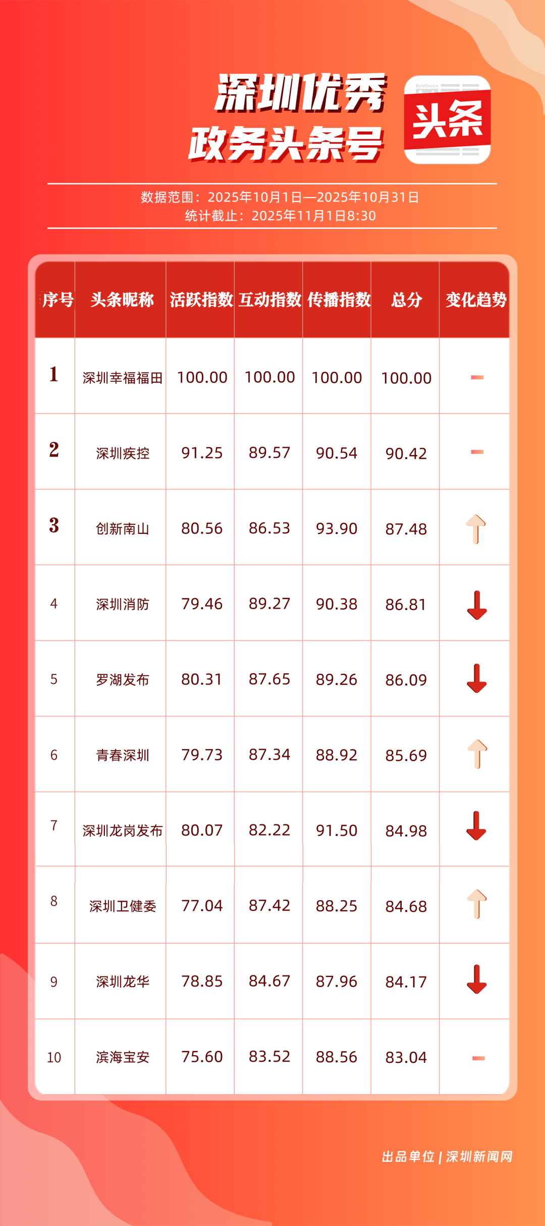 10月,“深圳幸福福田”“深圳疾控”“創(chuàng)新南山”“深圳消防”“羅湖發(fā)布”“青春深圳”“深圳龍崗發(fā)布”“深圳衛(wèi)健委”“深圳龍華”“濱海寶安”共10個政務頭條號入選“優(yōu)秀政務頭條號”榜單?!吧钲谛腋8L铩痹诨钴S、互動、傳播均收獲較好成果,蟬聯榜首;“深圳疾控”得分超90分,持續(xù)發(fā)布民生健康類內容,為市民健康保駕護航;“創(chuàng)新南山”內容創(chuàng)作緊扣民生與區(qū)域特色,位列榜單第三名。“深圳消防”“羅湖發(fā)布”等賬號也位列榜單前列,成為區(qū)域政務新媒體內容創(chuàng)新、信息傳遞的標桿。