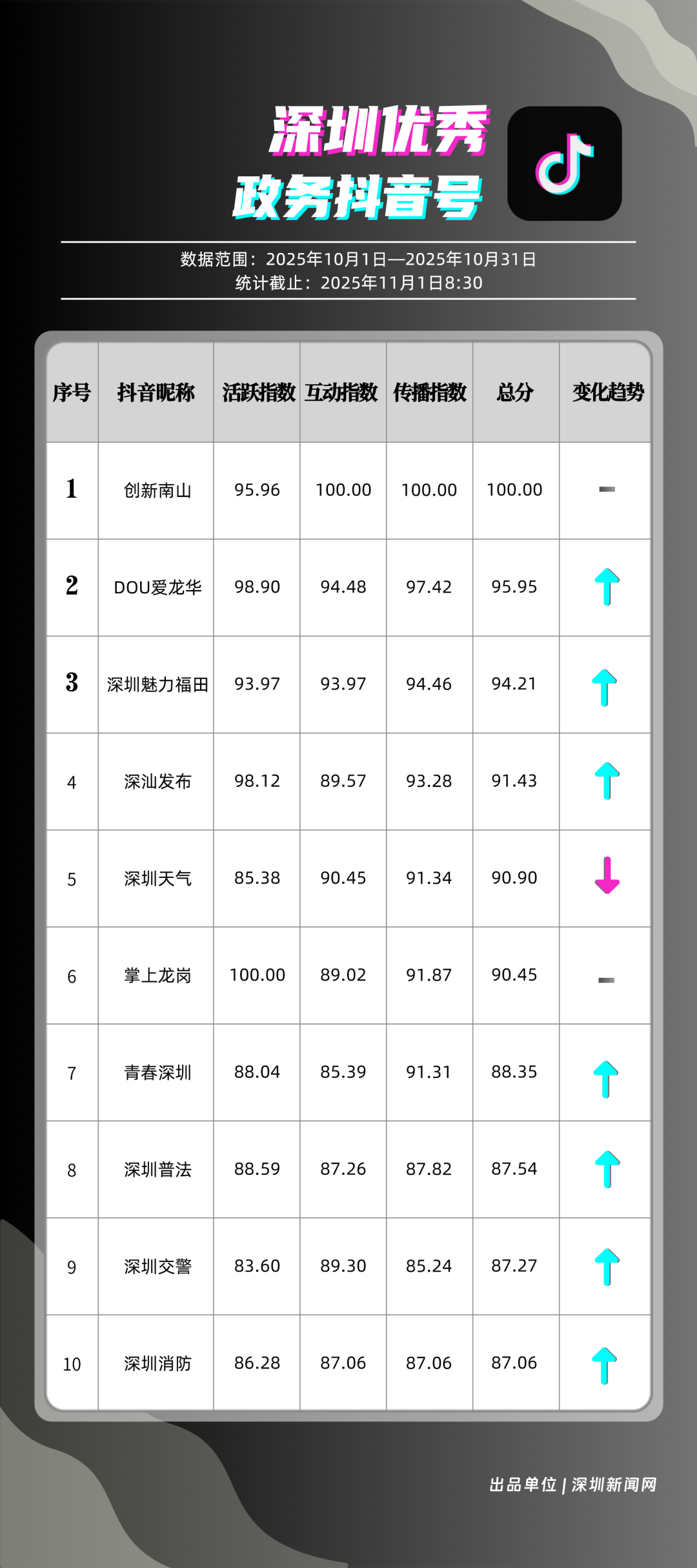 10月,獲得“優(yōu)秀政務抖音號”稱號的是“創(chuàng)新南山”“DOU愛龍華”“深圳魅力福田”“深汕發(fā)布”“深圳天氣”“掌上龍崗”“青春深圳”“深圳普法”“深圳交警”“深圳消防”。“創(chuàng)新南山”以總分100分居于榜首,展現出其內容創(chuàng)作對用戶的強大吸引力與傳播力;“DOU愛龍華”與“深圳魅力福田”分別位列第二、三位,得分在95分左右,排名較上期有所上升?!吧钌前l(fā)布”“深圳天氣”“掌上龍崗”等賬號得分均在90分以上,以年輕化表達展示實用信息,也收獲較好互動、傳播成績。