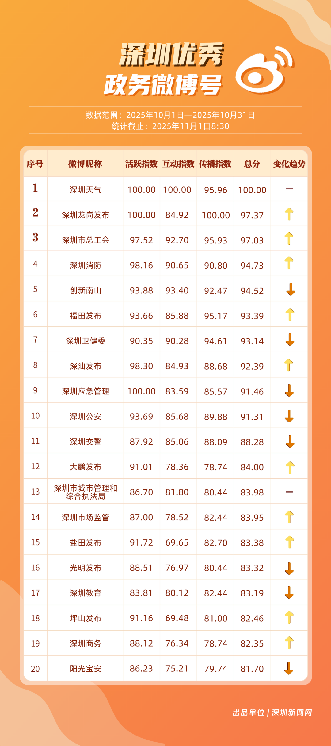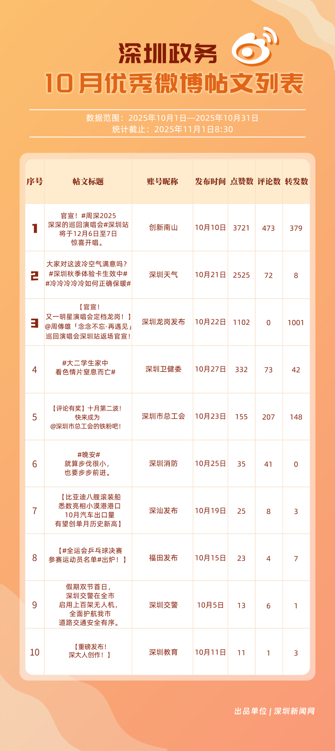 10月,20個賬號入選“優(yōu)秀政務微博號”榜單,其中包括:“深圳天氣”“深圳龍崗發(fā)布”“深圳市總工會”“深圳消防”“創(chuàng)新南山”“福田發(fā)布”“深圳衛(wèi)健委”“深汕發(fā)布”“深圳應急管理”“深圳公安”等。其中,“深圳天氣”高頻、及時地發(fā)布天氣相關內容,其中多篇關于“冷空氣”“入秋”帖文收獲較好互動和傳播效果,以100分位列榜單首位;“深圳龍崗發(fā)布”總分97.37分,居于榜單第二,其有關演唱會定檔、卷尺哥等內容的帖文獲得較好數據;“深圳市總工會”關注職工日常生活,以97.03分居于榜單第三。“深圳消防”“創(chuàng)新南山”等微博賬號也通過各自的特色內容,展現深圳城市治理、民生服務的溫度。