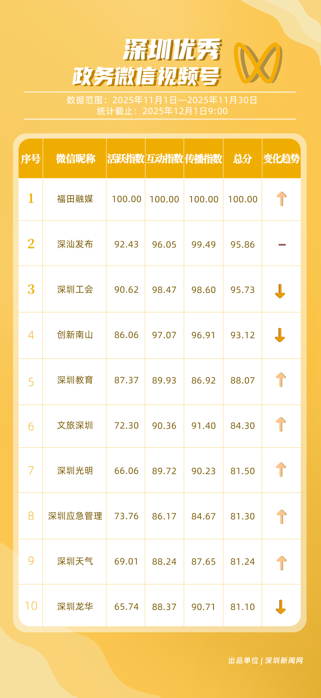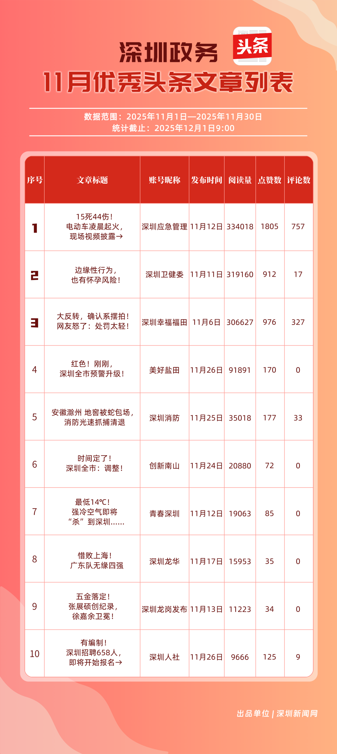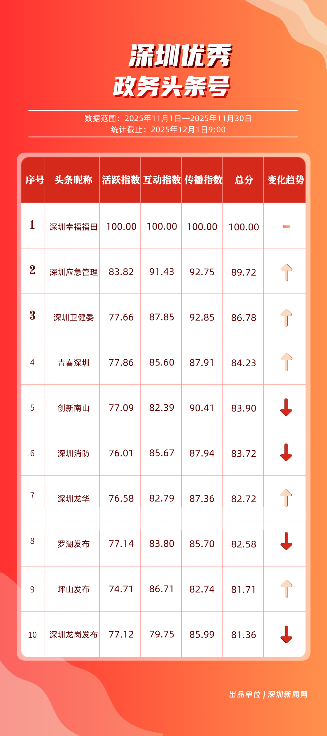 11月,“深圳幸福福田”“深圳應(yīng)急管理”“深圳衛(wèi)健委”“青春深圳”“創(chuàng)新南山”“深圳消防”“深圳龍華”“羅湖發(fā)布”“坪山發(fā)布”“深圳龍崗發(fā)布”共10個政務(wù)頭條號入選“優(yōu)秀政務(wù)頭條號”榜單?!吧钲谛腋8L铩卑l(fā)揮穩(wěn)定,以滿分成績蟬聯(lián)榜首,彰顯出強(qiáng)大的政務(wù)傳播力與影響力;“深圳應(yīng)急管理”積極發(fā)布應(yīng)急、安全類內(nèi)容,位居第二;“深圳衛(wèi)健委”則以優(yōu)質(zhì)健康類信息吸引市民關(guān)注,排名上升至第3位。“青春深圳”“創(chuàng)新南山”“深圳消防”得分在83分以上。相關(guān)上榜賬號以內(nèi)容創(chuàng)新為紐帶,聚焦民生,為城市治理現(xiàn)代化與民生服務(wù)精細(xì)化注入了鮮活力量。