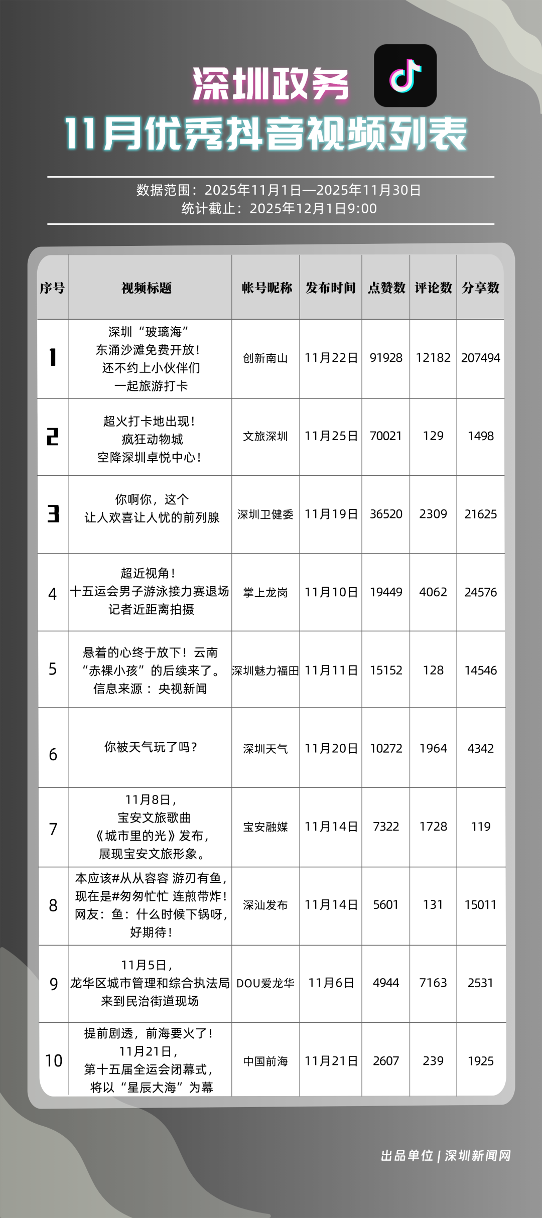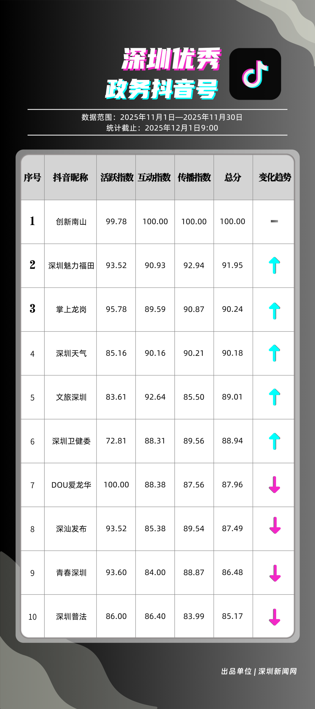 11月,獲得“優(yōu)秀政務(wù)抖音號”稱號的是“創(chuàng)新南山”“深圳魅力福田”“掌上龍崗”“深圳天氣”“文旅深圳”“深圳衛(wèi)健委”“DOU愛龍華”“深汕發(fā)布”“青春深圳”“深圳普法”?!皠?chuàng)新南山”多篇文旅、健康及出行相關(guān)內(nèi)容分享超10萬次,在互動、傳播方面表現(xiàn)亮眼,蟬聯(lián)榜首;“深圳魅力福田”在各方面指數(shù)評分較為均衡,位列第二名;“掌上龍崗”在活躍指數(shù)得分較高,能夠較好均衡內(nèi)容數(shù)量與質(zhì)量,位居第三,排名較上期有所提高?!吧钲谔鞖狻薄拔穆蒙钲凇钡荣~號緊隨其后,得分均在90分上下。上榜優(yōu)秀政務(wù)抖音號通過深耕內(nèi)容創(chuàng)作,收獲了高點(diǎn)贊、高分享的傳播效果,也推動評論區(qū)形成正向互動生態(tài),最終以優(yōu)質(zhì)內(nèi)容為核心載體,增強(qiáng)政務(wù)賬號影響力。