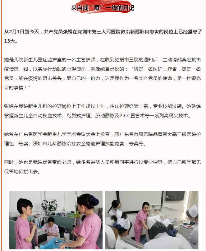 賴碧娟是深圳市婦幼保健院急診黨支部書記、急診科護士長。作為一名老黨員,抱著“疫情快些得到控制,最大程度減少損失”的信念,新冠肺炎疫情期間,她帶頭沖在一線,整個春節(jié)期間基本都在醫(yī)院加班。[詳細]