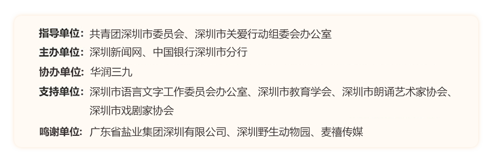 為助力建設(shè)良好的青少年閱讀環(huán)境,激發(fā)學(xué)生閱讀興趣,倡導(dǎo)親子閱讀,共建和諧家庭關(guān)系。2022年,“誰是故事大王·第六季”在共青團(tuán)深圳市委員會(huì)、深圳市關(guān)愛行動(dòng)組委會(huì)辦公室的指導(dǎo)下再出發(fā)?;顒?dòng)由深圳新聞網(wǎng)、中國銀行深圳市分行主辦,華潤三九協(xié)辦,得到了廣東省鹽業(yè)集團(tuán)深圳有限公司、深圳野生動(dòng)物園、麥禧傳媒的大力支持。更長的活動(dòng)周期,更豐富的參與形式,更專業(yè)的賽制,等你來解鎖與挑戰(zhàn)!讓閱讀成為最動(dòng)人的風(fēng)景,讓故事的魅力感動(dòng)深圳。說明:所有參賽者報(bào)名成功后,均承認(rèn)并允許主辦方將個(gè)人參加本次活動(dòng)的照片或視頻相關(guān)資料刊發(fā)在各類媒體雜志報(bào)紙上,用于活動(dòng)宣傳。